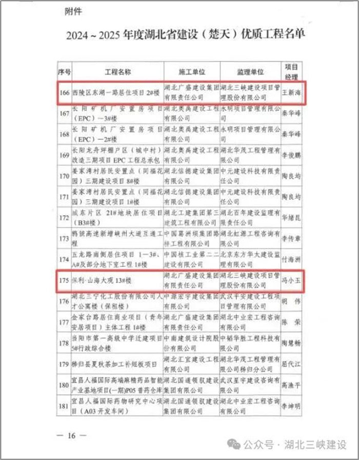 熱烈祝賀我公司在2024-2025年度湖北省建設(shè)(楚天)優(yōu)質(zhì)工程名單中,湖北三峽建設(shè)項(xiàng)目管理股份有限公司(含原宜昌平湖工程建設(shè)監(jiān)理有限責(zé)任公司)等5個(gè)項(xiàng)目榮獲我省“楚天杯”!